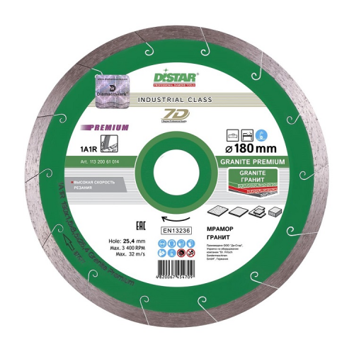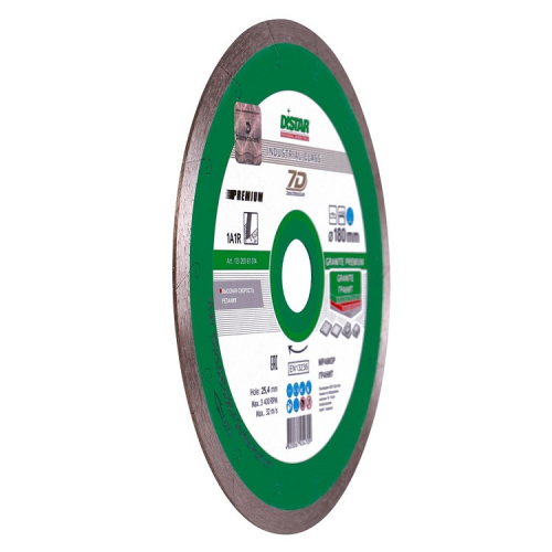 Круг діамантовий 1A1R 180 GRANITE PREMIUM підходить для різання плитки, мармуру, граніту і керамограніта. Круг алмазний DISTAR (11320061014) має діаметр 180 мм, товщину алмазного шару 1,5 мм, і висоту алмазного шару 8,5 мм і підходить для роботи з кутовими шліфувальними машинами з таким же діаметром. Може бути використаний як в професійних ремонтних сферах, так і для побутових потреб.