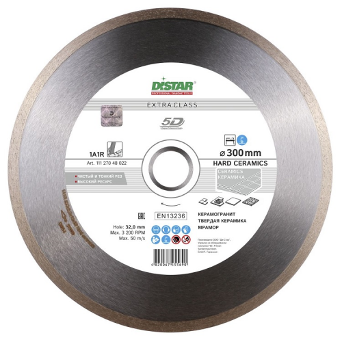 Круг алмазний вiдрiзний 1A1R Hard ceramics 5D DISTAR (11127048022) призначений для різання таких матеріалів: керамічна плитка, мармурові м'які породи, керамограніт, рельєфна глазурь. Використовується при роботі на великих верстатах і плиткорізах, а при невеликому діаметрі круга на ручних інструментах. Діаметр диска 1A1R Hard ceramics 5D DISTAR (11127048022) складає 300 мм. Круг з товщиною алмазного шару 1,6 мм, висотою 10 мм і посадковим отвором 32 мм не залишає відколів на поверхні.