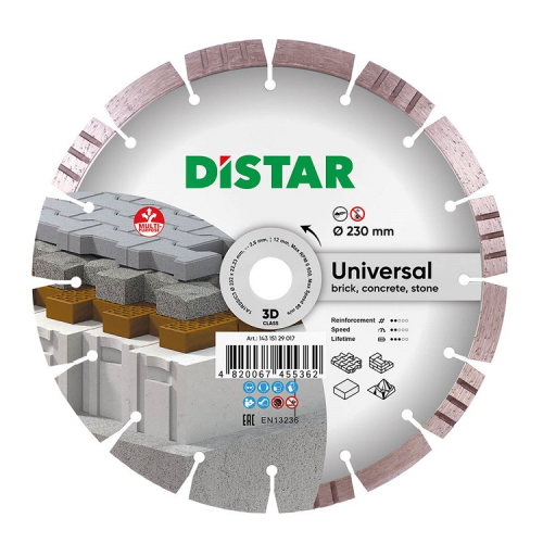 Круг алмазний вiдрiзний 1A1RSS/C3 232мм Bestseller Universal DISTAR (14315129017) дуже добре підходить для роботи з грубими матеріалами, і таким чином стає найкращим засобом для різання бетону, пісковику і тротуарної плитки. Також його можна використовувати для роботи з цеглою, кольоровим і чорним гранітом та армобетоном. Круг алмазний DISTAR Bestseller Universal оснащений міцним алмазним шаром спеціальної форми турбо сегментів в комбінації зі стандартними гладкими, висота якого складає 12 мм, що дозволяє виконувати максимально якісний різ зі швидкістю 0,35 погонних метрів в хвилину. Крім того показує досить великий ресурс роботи, що досягає 60 метрів. При тестуванні на армобетоні, марки М400, з армуванням 6 шт. на метр, алмазний диск показав ресурс роботи майже 30 метрів, при швидкості 0,3 м. Використовується диск Distar 1A1RSS Bestseller Universal на будь-яких КШМ зі стандартним посадковим отвором 22,23, при цьому представлений в декількох варіаціях, від 115 до 232 міліметрів в діаметрі.