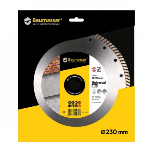 Круг алмазний Turbo Bestseller Universal 230x2,6x9x22,23 DISTAR (10215129017) ріже кольоровий граніт, бетон, цеглу, піщаник і тротуарну плитку. Підходить для ручної кутової шліфувальної машинки. Діаметр круга становить 230 мм, висота алмазного шару 9 мм, товщина алмазного шару 2,6 мм. Круг Bestseller Universal з посадковим отвором 22,23 мм використовується тільки по сухому різу, тому необхідно робити перерви в роботі.