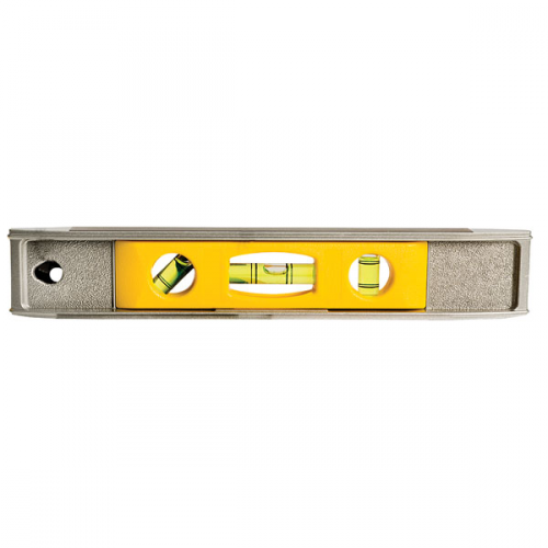 Рівень TORPEDO STANLEY 0-42-465 має міцний і легкий литий алюмінієвий корпус. Захищена від ударів центральна капсула рівня додає надійності. Три капсули рівня: горизонтальна, вертикальна і встановлена під кутом 45° для якісного та легкого вимірювання. Магнітна підстава ідеально підходить для роботи зі сталевими конструкціями. Довжина рівня складає 230 мм.