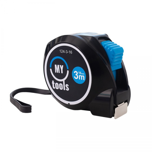 Рулетка EASY+ MyTools 124-3-16 з розміткою, що виконана великими чорними цифрами на світлому фоні. Кріплення гачка виковано за допомогою додаткової пластини, як приймає на себе ударне навантаження при змотуванні. Корпус виконаний з ABS-пластика - міцного, екологічно чистого матеріалу. Автоматичний замок не потребує натискання для фіксації стрічки. Прогумований корпус перешкоджає вислизанню з рук, а також пом'якшує силу удару при падінні.