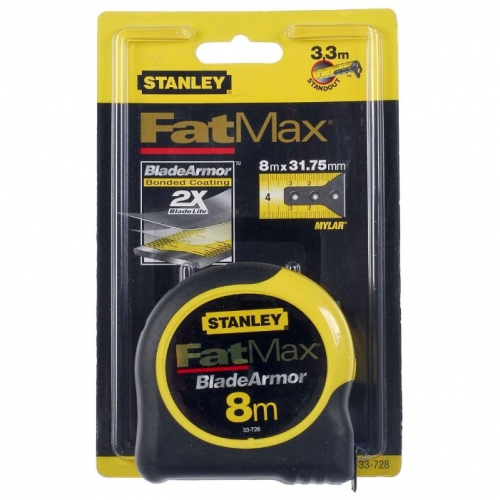 Рулетка FatMax Blade Armor STANLEY 0-33-728 з демпфуючою гумовою вставкою, що захищає кріплення гачка до стрічки від руйнування. Корпус виконаний з міцного АБС-пластика для тривалого терміну служби. Еластомерне покриття корпусу забезпечує додаткову зручність під час роботи. Рулетка STANLEY 0-33-728 має антиабразивне покриття ″Mylar″ та термопластичне покриття ″Blade Armor″ на перших 14 см стрічки, що збільшує термін служби і зменшує ймовірність пошкодження стрічки на 95%. Широка стрічка може бути висунута до 3.35 м без ″зламу″. Великий гачок з 3-ма заклепками має виступи з нижньої і верхньої сторони, забезпечуючи ефективне гальмування стрічки при змотуванні в корпус. Затиск для кріплення до поясу, щоб рулетка завжди була під рукою. Клас точності: II.