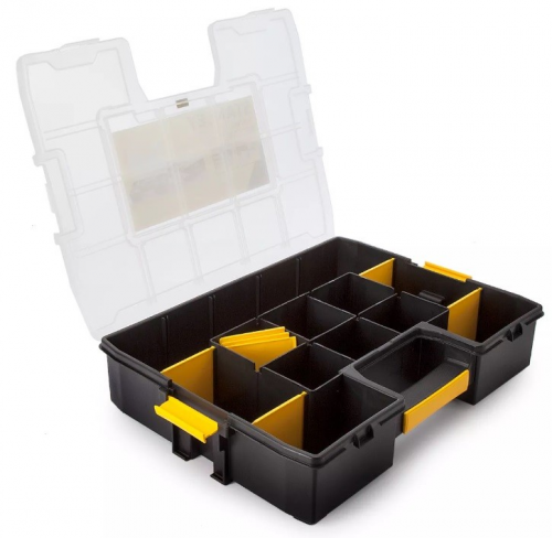 Органайзер професійний Sort Master STANLEY 1-94-745 з бічними замками дозволяє надійно з’єднувати і переносити разом до 3-х органайзеров. Переставні перегородки забезпечують безліч варіантів конфігурації відділень, дозволяючи організувати зберігання дрібних деталей і більшого інструменту. Особлива форма кришки запобігає переміщенню дрібних предметів з одного відділення в інше.