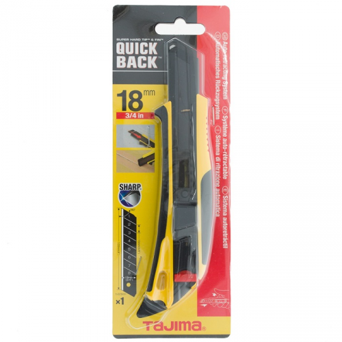 Ніж сегментний Quick Back TAJIMA DFC569B/Y1 виготовлений для екстримальних умов на будівельному майданчику. TAJIMA - єдиний виробник, який виготовляє металеву основу для ножів з високоякісної інструментальної сталі. Основа ножа піддається багаторазовому гартуванню у масляній ванні, завдяки чому вона стійка до стирання та зношування під час експлуатації, стійка до падінь та механічних навантажень, які виникають під час використання на будівельному майданчику. Фірмовий дизайн та двокомпонентна рукоятка забезпечують комфортне користування ножем та захищають долоні від натирань. Спеціальний гартований носик перетворює ніж у незамінного помічника, який, окрім основного призначення, можна використовувати як викрутку чи різець.