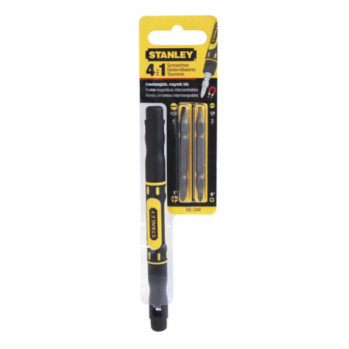 Викрутка кишенькова STANLEY 66-344M з 2-ма двосторонніми вставками. Магнітні вставки притягають і утримують дрібні гвинти. Дві двосторонні вставки: під прямий шліц Slotted (SL4, SL3); під шліц Phillips (PH0, PH1). Корпус виготовлений з двох матеріалів для зручності в роботі і надійного контролю інструменту.