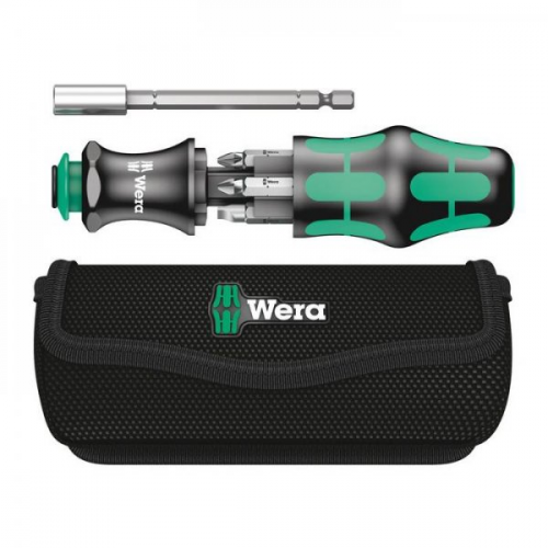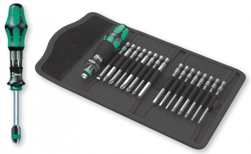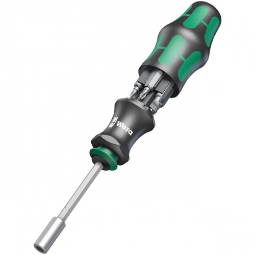 Викрутка KRAFTFORM WERA 05134491001 з багатокомпонентною ручкою Kraftform Plus для високої швидкості роботи і особливо ергономічного загвинчування. Вбудований в ручку магазин, в якому можна зберігати 6 біт. Висувний стержень для роботи у тісному просторі можна сховати у ручці. Також його можна витягти для використання з машинним приводом. Стопорне кільце і сильний постійний магніт гарантують надійну посадку біт. Набір у практичній поясній сумці.