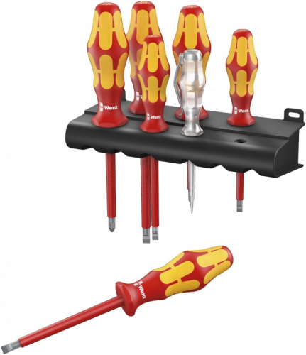 Набір діелектричних викруток Kraftform Plus WERA 05006147001 з поштучною перевіркою за стандартом IEC 60900. Поштучна перевірка у водяній бані під напругою 10000 В для безпечної роботи на обладнанні з максимально допустимою напругою 1000 В. Ручка Kraftform Plus для комфортної роботи без появи на руках мозолів і пухирів. Тверді зони ручки для високої швидкості роботи, в той час як м'які зони ручки забезпечують передачу великих моментів сили. Шестигранний край ручки для захисту від перекочування викрутки на робочому місці. Частина викруток з обробкою Lasertip: накінечник надійно "вгризається" в головку гвинта і запобігає вислизанню викрутки. Набір включає індикатор напруги і підставку для розміщення викруток.
