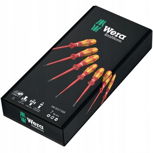 Набір діелектричних викруток SLIM WERA 05135961001 із завуженим робочим кінцем та зменшеним діаметром ручки для роботи в обмеженому просторі, і також з розташованими в глибині гвинтами та пружинними зажимами, з поштучною перевіркою за стандартом IEC 60900. Поштучна перевірка у водяній бані під напругою 10000 В для безпечної роботи на обладнанні з максимально допустимою напругою 1000 В. Ручка Kraftform Plus для комфортної роботи без появи на руках мозолів і пухирів. Тверді зони ручки для високої швидкості роботи, в той час як м'які зони ручки забезпечують передачу великих моментів сили. Шестигранний край ручки для захисту від перекочування викрутки на робочому місці. Набір включає підставку для розміщення викруток.