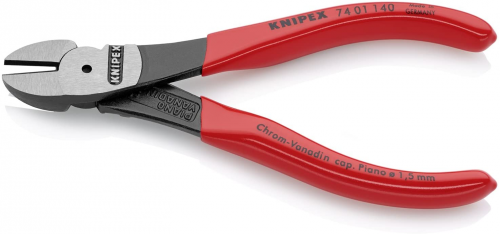 Кусачки бокові KNIPEX 74 01 140 підходять для найвищих тривалих навантажень. Висока ріжуча здатність при меншій витраті зусиль відбувається завдяки оптимальному погодженню кута ріжучих крайок, передавального відношення важелів і ергономічній конструкції ручок. Прецизійні ріжучі кромки твердістю приблизно 64 HRC призначені для всіх видів дроту, включаючи рояльну струну. Кусачки зроблені з високоякісної хром-ванадієвої сталі, ковані і загартовані в маслі.