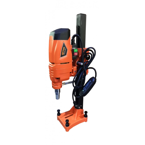 Бурильна установка зі стійкою та нахилом 45° GTM (DK-182) призначена для використання зі станиною. Серію SCY можна використовувати як в ручному режимі так і зі стійкою. В якості ріжучого інструменту використовуються алмазні корончасті свердла, відповідно до технічних характеристик моделей. Свердлильні машини GTM призначені для свердління отворів в бетоні, залізобетоні, штучному і натуральному камені та цеглі при будівництві будинків і споруд, аеродромів, злітно-посадкової смуги, дорожніх тунелів, залізничних конструкцій і т.д. Бурильна установка GTM DK-182 підходить для роботи в промислових умовах та в зонах пожежної небезпеки класів 2-2а і нижче. При температурі вище 28°C, рекомендується частіше робити перерву в роботі, для запобігання перегріву двигуна і збільшення терміну експлуатації устаткування. Бурильна установка GTM (DK-182) включає в себе електродвигун, редуктор, пульт керування. Шпиндель також має різьбу для кріплення алмазної коронки. Силову установку для використання зі стійкою потрібно прикріпити до каретки. За допомогою важеля, що знаходиться на каретці виконується переміщення алмазної коронки на потрібну глибину свердління. Основа стійки, повинна бути надійно зафіксована на поверхні за допомогою анкерного болта, який іде в комплекті. Двигун кріпиться на сталевій станині та пересувається за допомогою каретки. До роз'єму системи охолодження швидкознімним затискачем підключається пристрій подачі води або спеціальної емульсії, що значно збільшує термін експлуатації інструменту. Після закінчення процесу свердління зупиніть подачу води, машина повинна протягом однієї хвилини відпрацювати в режимі холостого ходу для охолодження електродвигуна і видування пилу і бруду з вентиляційних отворів електродвигуна. Для збільшення терміну експлуатації бурильної установки GTM DK-182 рекомендуємо після 30 хвилин роботи, зробити 10 хвилин відпочинку устаткування. В жодному разі не користуйтеся машиною в положенні двигуном вниз, вода може потрапити у двигун і виникне небезпека враження електричним струмом. Бурильна установка зі стійкою та нахилом 45° GTM (DK-182) має вагу 21 кг.