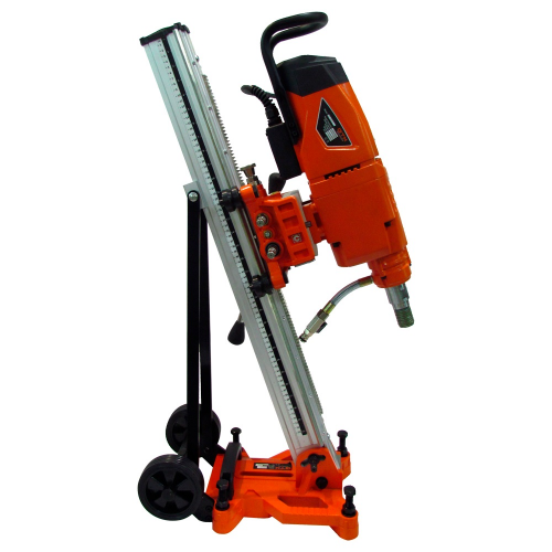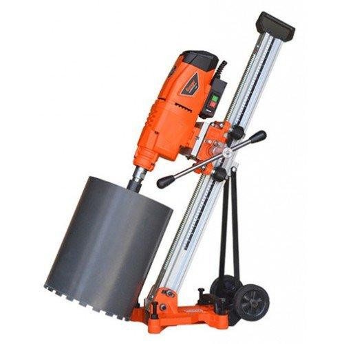 Бурильна установка зі стійкою та нахилом 45° GTM (DK-250/2/45) призначена для використання зі станиною. В якості ріжучого інструменту використовуються алмазні корончасті свердла, відповідно до технічних характеристик моделей. Свердлильні машини від компанії GTM призначені для мокрого та сухого свердління отворів в бетоні, залізобетоні, штучному і натуральному камені, цеглі, при будівництві будівель, споруд, аеродромів, дорожніх тунелів, залізничних конструкцій тощо. Бурильна установка GTM (DK-250/2/45) чудово підходить для роботи в промислових умовах та в зонах пожежної небезпеки класів 2-2а і нижче. При температурі навколишнього середовища вище 28°C, потрібно частіше робити перерву в роботі, щоб запобігти перегріву двигуна і збільшити термін експлуатації устаткування. Бурильна установка GTM (DK-250/2/45) включає в себе електродвигун, редуктор, пульт керування. Дві швидкості: 500 об/хв та 790 об/хв допоможуть вам швидше виконати потрібний обсяг роботи. Шпиндель також має різьбу для кріплення алмазної коронки. Силову установку для використання зі стійкою потрібно прикріпити до каретки. За допомогою важеля, що знаходиться на каретці виконується переміщення алмазної коронки на потрібну глибину свердління. Основа стійки, повинна бути надійно зафіксована на поверхні за допомогою анкерного болта, який іде в комплекті. Двигун кріпиться на сталевій станині та пересувається за допомогою каретки. До роз'єму системи охолодження швидкознімним затискачем підключається пристрій подачі води або спеціальної емульсії, що значно збільшує термін експлуатації інструменту. Після закінчення процесу свердління зупиніть подачу води, машина повинна протягом однієї хвилини відпрацювати в режимі холостого ходу для охолодження електродвигуна і видування пилу і бруду з вентиляційних отворів електродвигуна. Для збільшення терміну експлуатації бурильної установки GTM DK-250/2/45 рекомендуємо після 30 хвилин роботи, зробити 10 хвилин відпочинку устаткування. В жодному разі не користуйтеся машиною в положенні двигуном вниз, вода може потрапити у двигун і виникне небезпека враження електричним струмом. Бурильна установка з вертикальною стійкою GTM (DK-250/2/45) має вагу 27 кг.