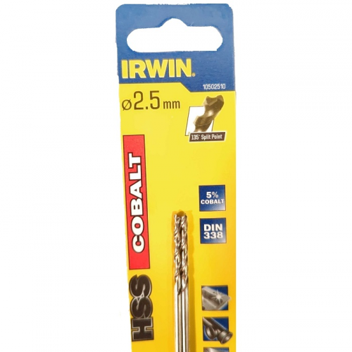 Свердло по металу IRWIN 10502510 призначене для свердління нержавіючої сталі. Дане свердло виготовлено зі швидкорізальної інструментальної сталі HSS з додаванням 5% кобальту. Завдяки такому складу підвищується термостійкість свердла і продовжується термін його служби. Ріжуча частина зроблена з підточкою поперечної кромки і кутом заточування 135°, що забезпечує відмінне центрування і зменшує навантаження під час свердліня. Свердло по металу HSS COBALT виробляє точне свердління і має відмінний відвід стружки завдяки відшліфованій канавці. Циліндричний хвостовик надійно кріпиться в патроні.