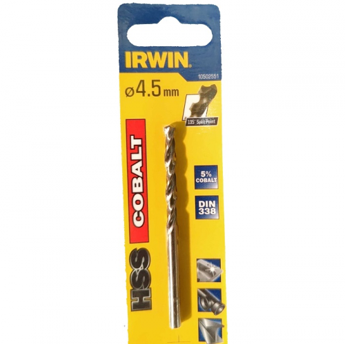 Свердло по металу IRWIN 10502551 призначене для свердління нержавіючої сталі. Дане свердло виготовлено зі швидкорізальної інструментальної сталі HSS з додаванням 5% кобальту. Завдяки такому складу підвищується термостійкість свердла і продовжується термін його служби. Ріжуча частина зроблена з підточкою поперечної кромки і кутом заточування 135°, що забезпечує відмінне центрування і зменшує навантаження під час свердліня. Свердло по металу HSS COBALT виробляє точне свердління і має відмінний відвід стружки завдяки відшліфованій канавці. Циліндричний хвостовик надійно кріпиться в патроні.