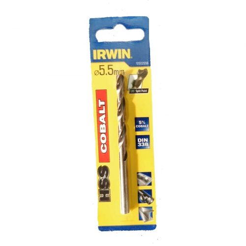 Свердло по металу IRWIN 10502556 призначене для свердління нержавіючої сталі. Дане свердло виготовлено зі швидкорізальної інструментальної сталі HSS з додаванням 5% кобальту. Завдяки такому складу підвищується термостійкість свердла і продовжується термін його служби. Ріжуча частина зроблена з підточкою поперечної кромки і кутом заточування 135°, що забезпечує відмінне центрування і зменшує навантаження під час свердліня. Свердло по металу HSS COBALT виробляє точне свердління і має відмінний відвід стружки завдяки відшліфованій канавці. Циліндричний хвостовик надійно кріпиться в патроні.