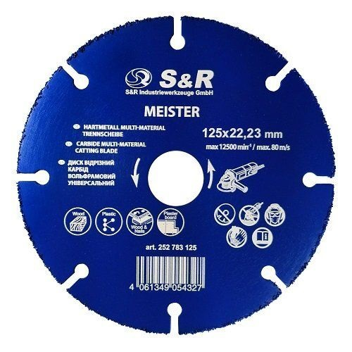 Диск карбід вольфрамовий S&R 125x22,23мм (252783125) універсальний відрізний диск, який завдяки своїм конструктивним особливостям легко ріже такі матеріали як: пластик, ламінат, ДСП, МДФ, фанеру, дерев'яні заготовки, матеріали з залишками цементу, з цвяхами та інше. Диск S&R 125x22,2мм виготовлений з металу по краях з крихтою твердосплавних зерен з карбід-вольфраму, які забезпечують якісну роботу з різними матеріалами. Завдяки сегментам диска можна довше працювати без перерви на охолодження. Диск S&R 125x22,2 мм карбід-вольфрам призначений для роботи з невеликими кутовими шліфмашинами.