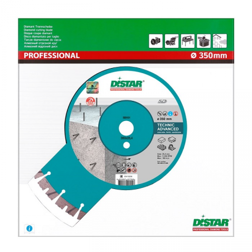 Кругдіамантовий вiдрiзний 1A1RSS 350 TECHNIC ADVANCEDd DISTAR (14320347025) застосовується на швонарізчиках і бензорізах для різання бетону зі слабким і середнім рівнем армування. Також ефективно справляється з багатьма іншими будматеріалами: цегла, граніт, піщаник. За рахунок унікального алмазного шару сегмента, висотою 15 міліметрів забезпечує максимально м'який і рівний рез. Крім того забезпечує високу швидкість роботи, яка досягає 2,5 метрів в хвилину при ресурсі в 300 метрів. За рахунок наявності спеціальних сегментів ефективно забезпечується висновок шламу з робочої області.