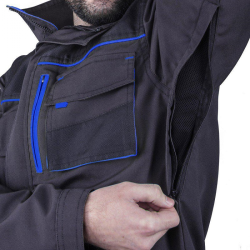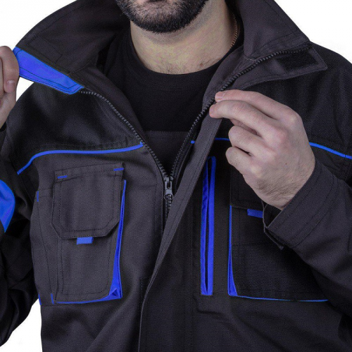 Куртка STEELUZ BLUE виготовляється з зносостійкої надміцної тканини CANVAS (щільність 273 г/м², склад: 65% - поліестер, 35% - бавовна). Захисні підсилюючі накладки з тканини OXFORD, щільністю 200 г/м², міцні накладки на колінах і по низу штанин - з тканини CORDURA, щільністю 223 г/м². Тканина має полотняне переплетення, що забезпечує необхідну повітропроникність і комфорт.