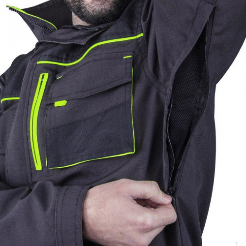 Куртка STEELUZ LIME виготовляється з зносостійкої надміцної тканини CANVAS (щільність 273 г/м², склад: 65% - поліестер, 35% - бавовна). Захисні підсилюючі накладки з тканини OXFORD, щільністю 200 г/м², міцні накладки на колінах і по низу штанин - з тканини CORDURA, щільністю 223 г/м². Тканина має полотняне переплетення, що забезпечує необхідну повітропроникність і комфорт.