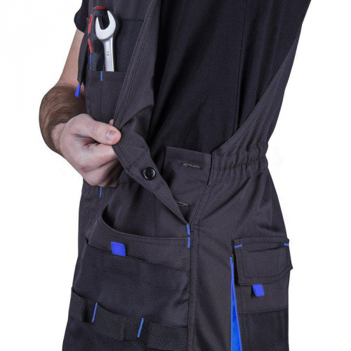 Напівкомбінезон STEELUZ BLUE виготовляється з зносостійкого надміцної тканини CANVAS (щільність 273 г/м², склад: 65% - поліестер, 35% - бавовна). Захисні підсилюють накладки з тканини OXFORD, щільністю 200 г/м², міцні накладки на колінах і по низу штанин - з тканини CORDURA, щільністю 223 г/м². Тканина має полотняне переплетення, що забезпечує необхідну повітропроникність і комфорт.
