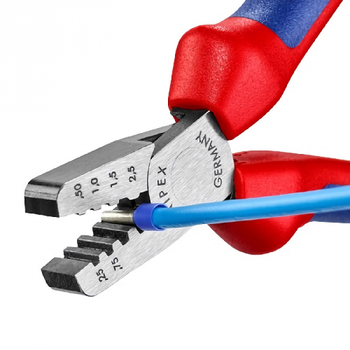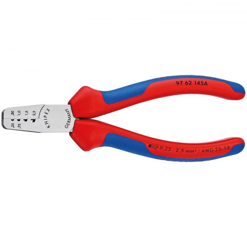 Інструмент для обтиску контактних гільз KNIPEX 97 62 145 A призначений для опресування контактних гільз у діапазоні перерізів від 0,5 до 2,5 мм². Кліщі для обтиску KNIPEX 97 62 145 A підходять також для опресування в маркованих трапецідальних профілях для надійного з'єднання гільзи та провідника. Виконаний данний інструмент з ванадаєвої сталі, кованої, загартованої в маслі. Довжина інструменту складає 145 мм.