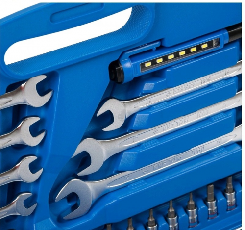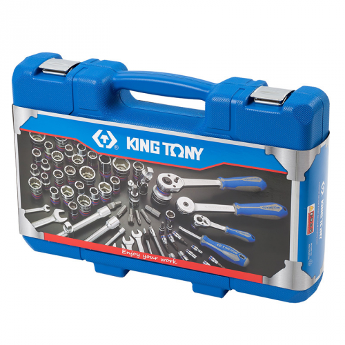 Набір інструментів універсальний 1/4"+1/2" KING TONY (SC7583MR) підібраний таким чином, щоб догодити власникам автотранспортних засобів та майстрам на СТО. Комплект з 83 аксесуарів призначений для розбирання або збирання вузлів та механізмів двигуна, трансмісії, ходової частини та елементів кузова. Інструмент підходить для відновлення українських та імпортних автомобілів. Такі інструменти корисні в гаражі чи багажнику машини. Для автомобіліста набір буде затребуваним подарунком. Набір представлений у пластиковому кейсі, що забезпечує цілісність інструменту під час зберігання або транспортування. Гідність валізки з ручкою – наявність форм під інструмент усередині. Власник, перед закриттям кейсу, легко визначить, якого аксесуару не вистачає і усуне нестачу на місці. Легована інструментальна сталь, з якої виготовлений інструмент, гарантує власнику відмовостійкість у роботі. На інструменті є маркування заводу-виробника, що підтверджує оригінальність продукції. Ключі, насадки, біти та подовжувачі зроблені з одного матеріалу, тому міцні та довговічні. Навіть світлодіодний ліхтарик, виготовлений на основі пластику у захисному корпусі.