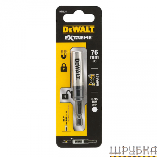 Магнітний тримач біт EXTREME Flextorq IMPACT DeWALT DT7524 утримує біту в потрібному положенні. Довжина тримача біт DeWALT DT7524 складає 76 мм. Призначений для використання з ударними шуруповертами, гайковертами.