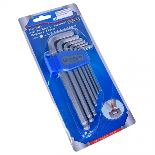 Набір Г-подібних шестигранників KING TONY 20107MR01 виготовлений з інструментальної легованої хром-ванадієвої сталі спеціального сплаву. Технологія виготовлення ключів включає метод гарячого кування з подальшою термообробкою, що надає ключам особливу міцність і високу надійність. Хромоване покриття захищає від корозії.