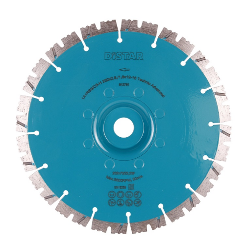 Круг діамантовий 1A1RSS 232X22,23F TECHNIC ADVANCED DISTAR (14315086018) підходить для різання бетону, бетону слабоармованного, цегли, граніту (всі види), пінобетону, пісковика (всі види) і тротуарної плитки. Зовнішній діаметр 232 мм, а розмір отвору 22,23 мм. Використовується для сухого різання. Ріже всі види природного каменю. Круг має товщину алмазного шару 2,6 мм, висоту алмазного шару 12 мм і 16 сегментів.