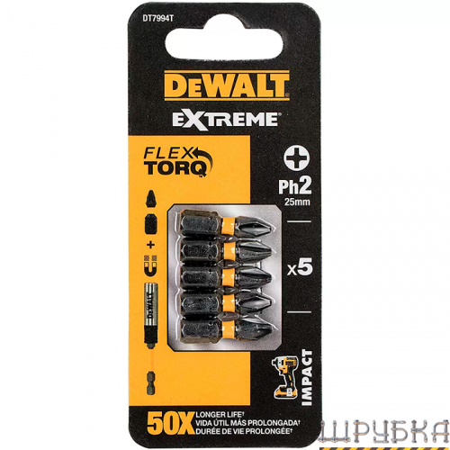 Набір біт DeWALT DT7994T зі шліцем Philips, розмір головки - Ph2. Набір виконаний з високоякісної сталі для твердості і довговічності.