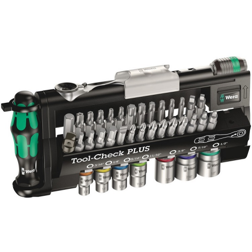 Набір біт TOOL-CHECK PLUS WERA 05056491001 включає тріскачку, біти, перехідник, головки і ручку-тримач. Дуже добре підходить для універсального використання та виконання великого числа робіт. Високоякісний бітотримач з ручкою Kraftform Plus для комфортної роботи без появи на руках мозолів і пухирів. Тверді зони ручки для високої швидкості роботи, м'які зони ручки для передачі великих моментів сили. Ручка-тріскачка для біт та особливо швидкої роботи, коли загвинчування через брак місця за допомогою машин або звичайним ручним інструментом не можливе. Швидка зміна напрямку обертання вправо-вліво і навпаки за допомогою перемикача реверсу. Швидке обертання (великим пальцем) за допомогою рифленого диска на голові тріскачки. Просто працювати навіть однією рукою. Ергономічна голова тріскачки і рукоятка: геометрія Kraftform з відмінно підігнаними під пальці контактними поверхнями. За рахунок приєднання біти прямо в голову тріскачки виходить мінімальна висота тріскачки в зборі. Малий кут повернення на 6° для точної роботи. Міцна штампована цільнометалева конструкція. Здатність навантаження більше 65 Нм. Бітотримач Rapidaptor з гільзою вільного ходу: може використовуватися як подовжувач, для моментальної зміни біт навіть найменших розмірів без допоміжного інструменту однією рукою. Загартовані до в'язкої твердості біти, для універсального застосування. Перехідник для торцевих головок. Зовнішній квадрат 1/4", зовнішній шестигранник 1/4". Головки майже без обмежень у застосуванні в ручному та машинному режимах. Індикатори інструментів "Take it easy" з кольоровим маркуванням розміру для простого і швидкого відбору потрібного інструменту. Не ковзає навіть при хваті замасленими руками. З канавкою під кульковий фіксатор. Для шестигранних гвинтів і гайок. Хромванадієва сталь, матове хромоване покриття.