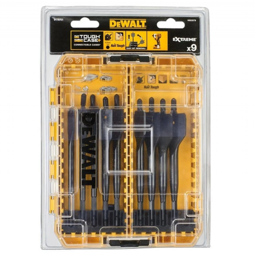 Набір перових свердел DeWALT DT70751 з шестигранними хвостовиками для ефективного свердління отворів діаметром від 12 мм до 32 мм в дереві будь-якої твердості та матеріалів з деревини. Підходять для роботи з інструментами серії Impact. Скошена зовнішня ріжуча кромка дозволяє здійснювати чисте і швидке свердління отворів. Шестигранний хвостовик запобігає прокручуванню в патроні при великих навантаженнях. Набір поміщений в новий фірмовий модульний бокс Tough Case. Кейс виконаний з високоміцного склопластика, адаптований для суворих умов експлуатації на будівельних майданчиках.