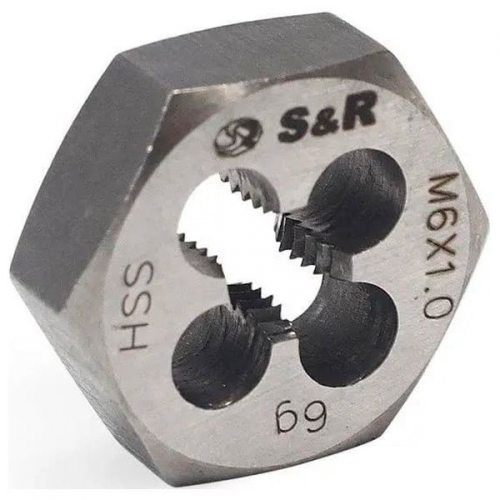 Плашка 6мм S&R 111201006 використовується для нарізування зовнішньої різьби. Виготовлена плашка зі швидкорізальної сталі HSS, яка ефективно нарізає різьбу у всіх циліндричних деталях меншої твердості. Плашка має шестигранну форму корпуса. Плашка S&R M6x1,0мм широко використовується в ремонтних і виробничих роботах на СТО, в майстернях, а також для інших сфер, де необхідно нарізування або відновлення різьблення.