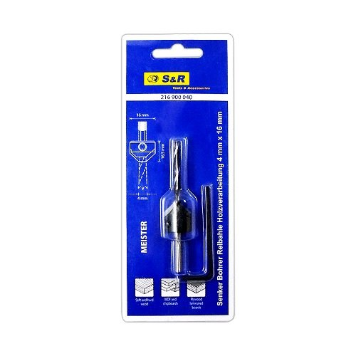 Свердло з зенкером S&R діаметром 4мм виготовлено з якісної високовуглецевої сталі, яка якісно виконує складні завдання, забезпечуючи свердлу довгий термін служби. На кінці свердло обладнано вістрям для створення точного отвору в заданому місці. Зенкер діаметром 16 мм., якісно обробить поглиблення під гвинти, засвердлить конічні отвори потрібної глибини, а також зніме фаски в дерев'яних отворах.
