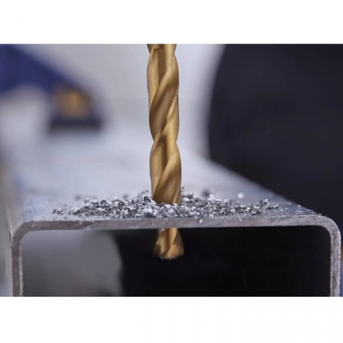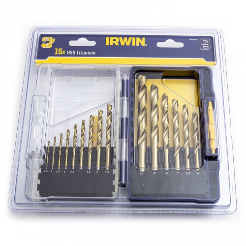 Набір свердл HSS PRO TITANIUM IRWIN IW3038501 з відшліфованою різальною крайкою під кутом 135 градусів гарантує прекрасне самоцентрування. Покриття нітридом титану зменшує тертя та збільшує термін експлуатації свердла. Збільшена швидкість свердління на 40-60% в порівнянні зі звичайними свердлами, а швидкість подавання на 10-20%. Мінімальне нагрівання. Нітрид титану — поганий провідник тепла, тому тепло, що виділяється в процесі свердління, спрямовується в стружку й охолоджувальну рідину та в меншій мірі у саме свердло. Циліндричний хвостовик надійно кріпиться в патроні, що запобігаю прокручуванню свердла.