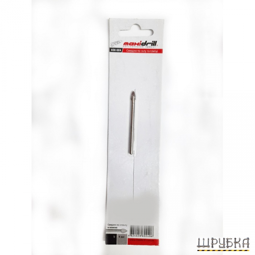 Свердло MAXIDRILL 400-004 по плитці та склу має твердосплавну ріжучу кромку з конусним алмазним заточуванням вістря для надточного засвердлювання. Твердосплавна пластина закріплена високотемпературною пайкою. Зі свердлом слід працювати при низькій частоті обертання та з охолодженням (вода, скипидар, гас).