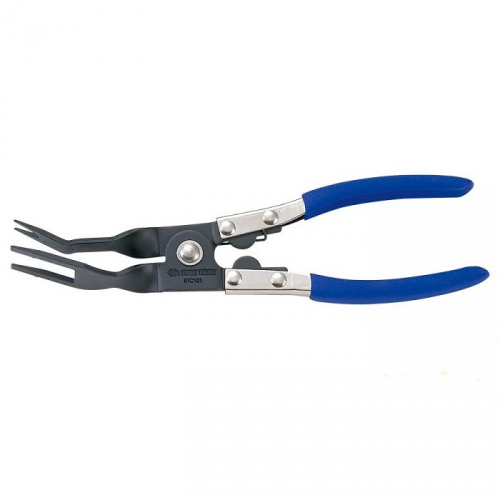Знімач кріплень дверних карт KING TONY 9TC101 має пружинний механізм. Кліщі, при натисканні руків'я яких, губки, виконані у вигляді двох пластин, розводяться. У вихідному положенні губки пластин складені і виглядають як єдина пластина: верхня, з прорізом під кліпсу розташовується в центрі, нижня - з боків. Ця конструкція підводиться під капелюшок кліпси. При зведенні ручок щипців зовнішня пластина упирається в поверхню деталі, а внутрішня, захопивши капелюшок пістона, виймає його з кріпильного отвору. Підходить для демонтажу всіх кліпс які виготовлені у вигляді єдиного литого компонента.