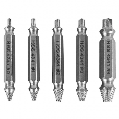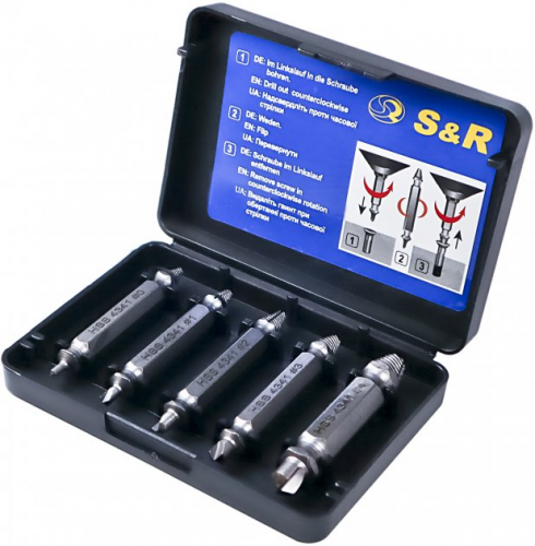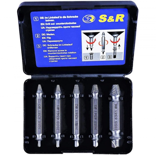 Набір екстракторів S&R 111400005 призначений для викручування гвинтів з пошкодженими головками. Екстрактори двосторонні, кожна одиниця використовується для просвердлювання головки, а потім подальшого відкручування самого гвинта. Екстрактори з набору підходять для роботи з найбільш популярними дрилями.