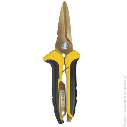 Ножиці універсальні STANLEY STHT0-14103 для різання тонкого листового металу, дроту, картону, пластику і т.д. Леза виготовлені з високоякісної сталі з титановим покриттям для тривалого терміну служби. Ручки з двох матеріалів для комфорту в роботі. Хвостовик лез на всю довжину ручок, подібна конструкція забезпечує тривалий термін служби інструменту. Довжина ріжучої поверхні складає 60 мм.