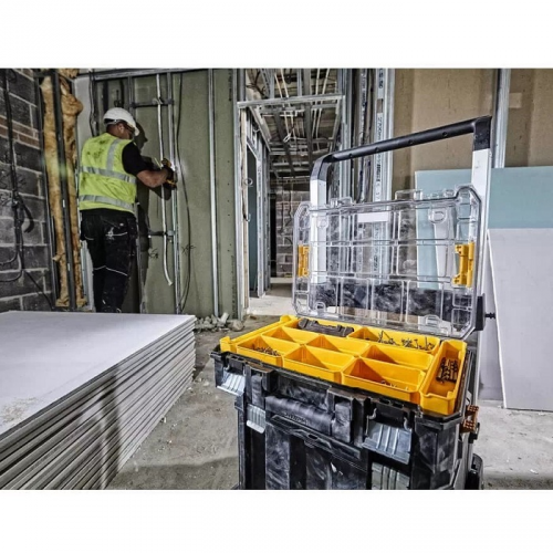 Органайзер TSTAK з прозорою кришкою DEWALT DWST82968-1 стане чудовим місцем для зберігання дрібних елементів, які часто використовуються. Клас захисту IP54 - захист від пилу та бризок, що потрапляють на органайзер в будь-якому з напрямків. Прозора кришка з полікарбонату для кращої видимості кріплення та інструменту. Металеві замки володіють захистом від корозії. Бічні замки призначені для з’єднання з іншими елементами системи. Органайзер DEWALT DWST82968-1 має 10 знімних чашок. Ємність: 7,8 л.