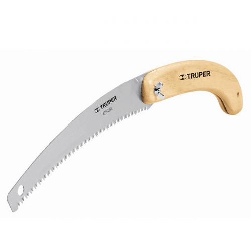 Ножівка садова TRUPER STP-12PL складна, з вигнутим лезом довжиною 300 мм, яке виготовлене з високоякісної японської сталі SK5. Має зуб з трьохгранною заточкою зворотньої направленості. Найкращі якості відкриваються під час роботи з живими гілками від 30мм. Завдяки вигнутому профілю леза значно зменшується зусилля, яке треба докладати під час роботи. Поверхня зрізу гладенька, а краї рівні, що сприяє надійному зарощуванню новою корою. Ручка виготовлена з дерева. Лезо легко розкладається та надійно фіксується за допомогою гвинта та гайки-баранця.
