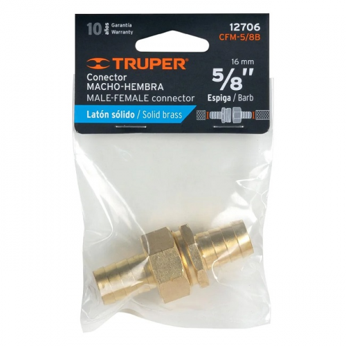 З'єднувач для шлангу TRUPER CFM-5/8B – садовий ремонтний, виготовлений з латуні, для надійності і практичності в роботі. Використовується для відновлення (з'єднання) шлангу розміром 5/8 дюйма. У місці різьбового приєднання не протікає завдяки щільним гумовим кільцям.