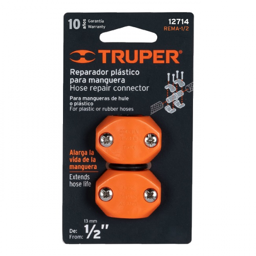 З'єднувач для шлангу TRUPER REMA-1/2 виготовлений з ударостійкого пластику, для легкості і практичності у використанні. Застосовується для відновлення шлангу розміром 1/2" дюйма. У місці приєднання не протікає завдяки щільним гумовим кільцям, що розташовані на штуцерах.