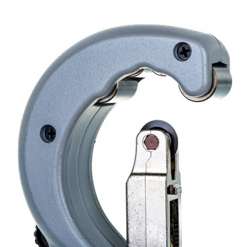Труборіз дисковий ZENTEN 7576-1 застосовується для різу мідних, нержавіючих та стальних оцинкованих труб діаметром від 6 мм до 76 мм. Дискові труборізи ZENTEN INOX PLUS QUICK створені щоб витримувати максимальні навантаження. Дана серія відрізняється надзвичайною легкістю під час роботи. Корпус відлитий з магнієвого сплаву. Напрямна з плавним безступеневим ходом згладжує зусилля подачі під час різки, навіть якщо оператор перестарався з прижимом, ривки на руку в такому випадку практично не передаються. Кожен опорний ролик встановлено на два ряди гольчатих підшипників, що в сумі 8шт. Опорні ролики виконано з високоякісної нержавіючої сталі. На відміну від стальних роликів вони виключають явище дифузії (змішуванню металів) і в місці різу гарантовано в майбутньому не виникне іржі. Спеціальний ріжучий диск для твердих типів металу встановлено також на гольчатому підшипнику, що захищає його від швидкого виходу з ладу, надає легкість різу, та впливає на якість і точність різу. Фірмова система швидкого спуску QUICK дозволяє однією кнопкою як відводити лезо в початкове положення (втягується пружиною) так і опускати на заготовку, що суттєво економить час оператора. Труборіз оснащено гратознімачем японського виробника NOGA, який є повністю змінним, і можна використовувати окремо.