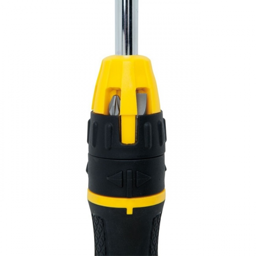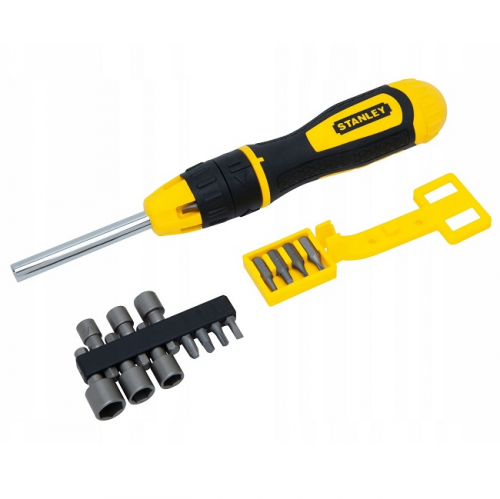 Бітотримач викруткового типу STANLEY STHT0-62574 з храповим механізмом і набором з двадцяти біт. Рукоятка з профілем з трьома гранями, виконана з двокомпонентного матеріалу, з текстурою, що забезпечує максимальний крутний момент і комфорт користувача. Хромований стрижень для захисту від корозії. Трьохпозиційний механізм хропіння для кращого виконання роботи. Конструкція з підшипником з пружинним механізмом для полегшення доступу до вставок в рукоятці. Запатентована система зберігання вставок в рукоятці біля основи стрижня, а також в орендованому ковпачку задньої частини рукоятки забезпечує легкий доступ і надійність зберігання.