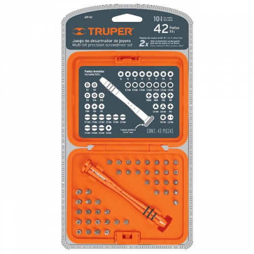 Набір викруток прецизійних TRUPER JOY-43 з бітами в наборі. Біти виготовлені з хромо-ванадієвої сталі, що забезпечує тривалий термін експлуатації. Магнітний тримач біт надійно утримує біту та дозволяє якісно виконати роботу. Алюмінієва ручка для більшої надійності та якісного виконання роботи. Відсік для зберігання вставок всередині ручки для більшого комфорту.