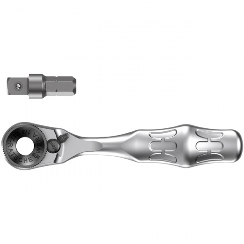 Ручка-тріскачка комфортна для біт і особливо для виконання швидкої роботи, коли через брак місця загвинчування за допомогою машин або звичайним ручним інструментом неможливо. Швидка зміна напряму обертання вправо-вліво та навпаки за допомогою перемикача реверсу. Швидке обертання за допомогою рифленого диска на головці тріскачки. Просто працювати навіть однією рукою. Ергономічна головка тріскачки та рукоятка: геометрія Kraftform з відмінно підігнаними під пальці контактними поверхнями. За рахунок приєднання біти прямо в головку тріскачки виходить мінімальна висота тріскачки в зборі. Мінімальний кут повернення на 6° для точної роботи. Міцна штампована суцільнометалева конструкція зі здатністю навантаження більше 65 Нм.