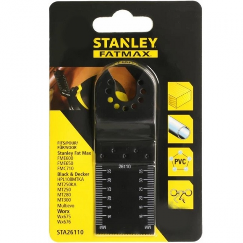 Полотно пильне занурювальне STANLEY STA26110 для багатофункціонального інструменту MT300KA. Призначене для розрізання, занурювального пиляння та різання врівень деревини, пластиків, тонкостінних труб та профілів з кольорових металів, цвяхів та гвинтів.