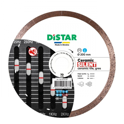 Круг алмазний вiдрiзний 1A1R CERAMIC SILENT 200мм DISTAR 10170516019 для різання керамограніту на верстатах. Диск має сендвіч-тип. Така конструкція диска знижує високу частоту. Рівень шуму близько 10 дБ. Фактично чутно лише шум двигуна верстата. Диск виготовлений з урахуванням Hard Ceramic Advanced. Алмазний шар має графітову крихту.