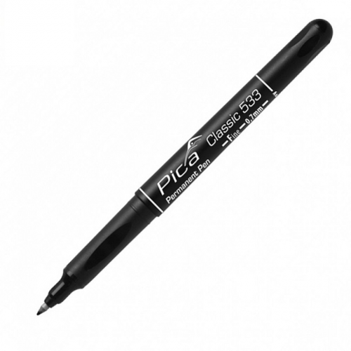 Маркер перманентний Classic Permanent Pen FINE PICA 533/46 - універсальний ультратонкий маркер 0.7мм, призначений для великої кількості різних матеріалів. Особливо зручним використанням маркера Pica Classic є його застосування при фінішних оздоблювальних будівельних роботах, а також його використання в електромонтажі для маркування кабелів. Завдяки справжньому та якісному перманентному чорнилу розробленому компанією Pica маркування надзвичайно добре тримається на таких поверхнях як електрокабель, оцинковані метали, пластик, скло, кераміка чи ламінована деревина.